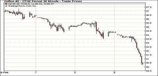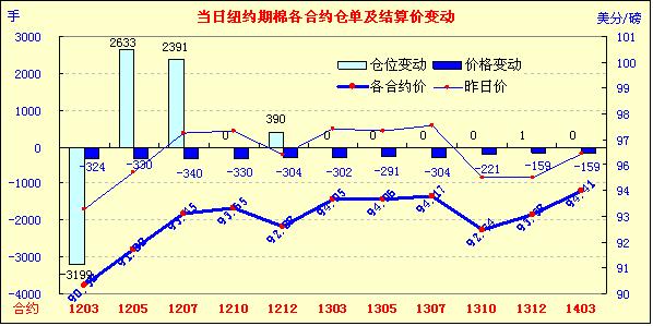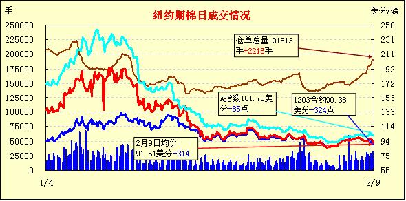 2月9日,因美國(guó)農(nóng)業(yè)部(USDA)最新棉花供需預(yù)測(cè)報(bào)告利空及指數(shù)基金展期繼續(xù)對(duì)市場(chǎng)形成打壓,紐約期棉連續(xù)第三個(gè)交易日大幅收跌,近期1203月合約結(jié)算價(jià)90.38美分/磅,跌324點(diǎn),1205月合約結(jié)算價(jià)91.88美分/磅,跌330點(diǎn),其他遠(yuǎn)期合約跌幅159-340點(diǎn)不等。市場(chǎng)交易活躍,成交量超過(guò)6萬(wàn)手。當(dāng)日市場(chǎng)早盤窄幅震蕩,基本面利空導(dǎo)致賣盤涌入,打壓市場(chǎng)一路走低,盤中近期3月合約最低至90.23美分/磅,為去年12月30日以來(lái)最低點(diǎn);5月合約最低至91.81美分/磅,震蕩幅度426點(diǎn);尾盤時(shí)期棉雖有微幅反彈,但盤終各合約均大幅收跌。昨日美棉出口表現(xiàn)平平,美國(guó)農(nóng)業(yè)部2月份最新供需預(yù)測(cè)報(bào)告中棉花期初庫(kù)存及產(chǎn)量調(diào)增,消費(fèi)調(diào)減,期末庫(kù)存大幅調(diào)增,這對(duì)期棉造成壓力;此外近期3月合約臨近交割期,指數(shù)基金持倉(cāng)展期連續(xù)第三個(gè)交易日致期棉承壓。