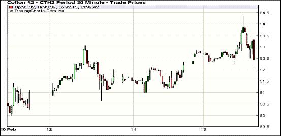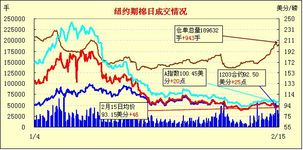 2月15日,紐約期棉在買盤支持下全面收漲,近期1203月合約結(jié)算價92.50美分/磅,漲25點,主力1205月合約結(jié)算價93.48美分/磅,漲64點,其他遠期合約漲幅23-72點不等。市場交易活躍,登記庫存持續(xù)增加。主力5月合約早盤在93-93.4美分/磅之間窄幅震蕩;午盤后在買盤支持下一路走高,當日最高至94.57美分/磅;尾盤受美元走強、美股走弱拖累回吐部分漲幅,盤終中幅收漲。近期3月合約還有四個交易日進入第一交割通知日。當日經(jīng)濟層面圍繞希臘救助方案依然存在疑問,但因中國表示對歐洲提供支持,市場信心得到提振。基本面上美國農(nóng)業(yè)部將于今日公布上周的美棉出口周報,市場期待進一步指引。