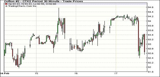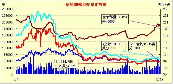 2月17日,紐約期棉全面收跌,主力合約結(jié)束五連漲局面,當(dāng)日結(jié)算價92.65美分/磅,跌106點(diǎn),其他遠(yuǎn)期合約也普遍大幅收跌。投資者在小長假前表現(xiàn)活躍,成交量較前一日明顯增加。當(dāng)日主力合約交易前半段在93.8-94.3美分/磅之間窄幅震蕩,當(dāng)日最高點(diǎn)為94.29美分/磅;午盤后賣盤涌入打壓市場快速下跌,該合約至當(dāng)日最低點(diǎn)94.29美分/磅,震蕩幅度190點(diǎn);尾盤時分小幅反彈回補(bǔ)部分跌幅,盤中該合約收跌100余點(diǎn)。外部谷物及油料市場普遍走高。3月合約將在下周四(2月23日)進(jìn)入第一交個通知日,當(dāng)日收于91.45美分/磅,跌100點(diǎn)。因市場對希臘將獲得第二輪貸款、歐元區(qū)債務(wù)危機(jī)即將得到解決的樂觀情緒升溫,歐美股市及外部大宗商品市場受提振普遍走高;而期棉由于3月合約即將進(jìn)入交割期,基金展期交易繼續(xù)對期棉形成打壓,導(dǎo)致其在周末小長假大幅收跌。下周一(2月20日)是美國總統(tǒng)日,紐約期棉市場休市一天。