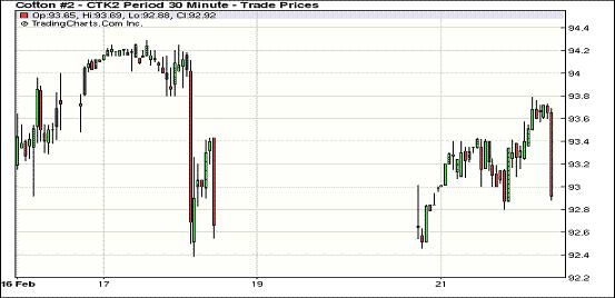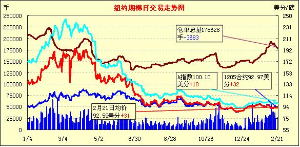 2月21日,因期待已久的希臘救助協(xié)議終獲批準,給市場人氣帶來提振,美元走軟、歐美股市全線走高,紐約期棉受支撐除近期3月合約小跌外,其他合約普遍收高,主力5月合約結(jié)算價為92.97美分/磅,漲32點。 當(dāng)時市場平穩(wěn)開盤,午盤時主力合約受外部谷物及油料市場走低拖累,至當(dāng)日最低點92.46美分/磅;后買盤介入促期棉低點反彈,該合約最高至93.79美分/磅,震蕩幅度133點;尾盤時買盤獲利回吐部分漲幅,盤終該合約小幅收漲。近期3月合約收于91.25美分/磅,跌20點。歐洲官員同意向希臘提供1,300億歐元救助資金,幫助該國避免出現(xiàn)債務(wù)違約并留在歐元區(qū)內(nèi)部,這一利好消息促使期棉市場普遍走高。