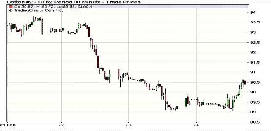 2月24日,紐約期貨由前兩日的大跌中恢復,棉價在商業(yè)買盤的刺激下反彈。當日5月合約開盤價89.30(美分/磅,下同),最高價90.72,最低價89.02,收盤價90.41,結算價90.15,漲92點,成交量14388手,減少10215手。據(jù)分析,最近一段時間,美國紡織廠以低庫存維持生產(chǎn),因此棉價大跌之后吸引紡織廠入市采購。此外,上周美棉出口周報顯示,本年度陸地棉簽約量較前周上升75%也為市場提供支撐。