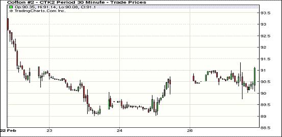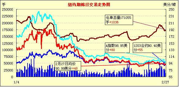 2月27日,紐約期棉在買盤支持下延續(xù)上周五的漲勢(shì)繼續(xù)收高,近期3月合約結(jié)算價(jià)90.40美分/磅,漲55點(diǎn),主力5月合約結(jié)算價(jià)90.67美分/磅,漲52點(diǎn),其他遠(yuǎn)期合約也均小幅告漲,普遍站于91美分之上。市場(chǎng)在當(dāng)日表現(xiàn)平淡,成交量持續(xù)萎縮。當(dāng)日早盤在90.4-91美分之間窄幅震蕩,后半段大幅波動(dòng),主力5月先在買盤刺激下上揚(yáng)至當(dāng)日最高點(diǎn)91.34美分/磅,接著買盤獲利平倉(cāng)打壓市場(chǎng)迅速下跌,該合約跌破90美分/磅關(guān)鍵阻力位,回落至當(dāng)日最低點(diǎn)89.74美分/磅,震蕩幅度160點(diǎn);尾盤時(shí)買盤重回市場(chǎng)促該合約反彈并中幅收漲。當(dāng)日外部大豆、玉米及小麥期貨走高,原油期貨走軟。上周期棉大幅下跌,各合約價(jià)位普遍稍高于90美分,這一價(jià)位吸引了買盤介入,促市場(chǎng)繼續(xù)收高。