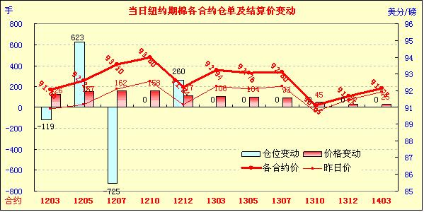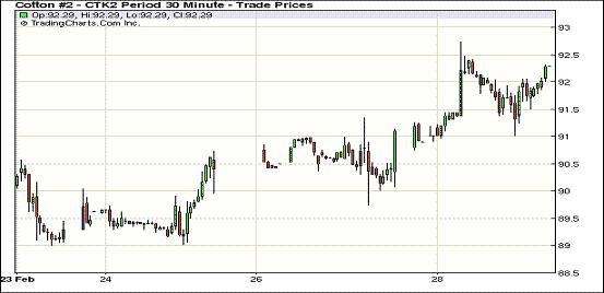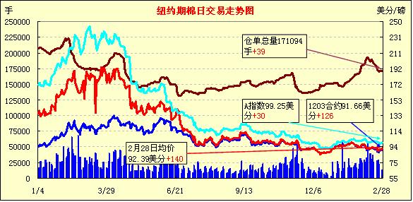 2月28日,受美元走低、美股及外部谷物市場全面走高提振,紐約期棉連續(xù)第三個交易日收漲,近期3月合約結(jié)算價91.66美分/磅,漲126點,主力5月合約結(jié)算價92.24美分/磅,漲157點,其他遠期合約漲幅25-162點不等。當日市場開盤后震蕩走高,主力1205月合約上行至當日最高點92.74美分/磅;后買盤獲利平倉,打壓市場高位回落;尾盤時在外部谷物市場帶動下強勢反彈,盤終前7份合約漲幅過百。當日外部大豆、玉米及小麥期貨走高,原油期貨走軟。