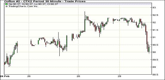 2月29日,紐約期棉在賣盤打壓下結束三連漲全面告跌,近期3月合約結算價89.86美分/磅,跌180點,主力5月合約結算價90.44美分/磅,跌180點,其他遠期合約跌幅26-143點不等。市場在2月的最后一個交易日表現略微活躍,成交量較前幾日有所增加。當日主力合約早盤圍繞92美分/磅震蕩,午盤后賣盤打壓導致市場迅速回落,該合約跌破90美分阻力位,最低至89.88美分/磅;尾盤時略有反彈,但終以大跌收盤。當日外部谷物及油料市場全面走高。雖然當日外部商品市場普遍走高,但期棉因基本面疲軟導致賣盤重入市場,各合約承壓下挫,期待新一期美棉出口周報指引。
