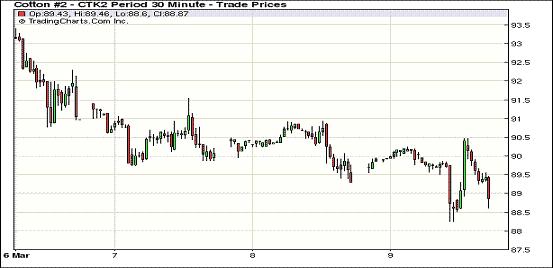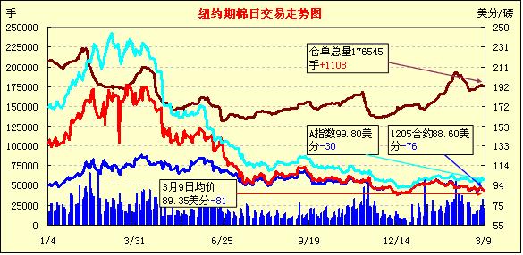 3月9日,印度政府開會宣布繼續(xù)推行棉花出口禁令,美國農(nóng)業(yè)部最新預(yù)測全球棉花消費(fèi)調(diào)減及期末庫存調(diào)增,紐約期棉承壓連續(xù)第四個交易日收跌,主力5月合約結(jié)算價為88.80美分/磅,跌76點(diǎn),7月合約結(jié)算價89.74美分/磅,跌96點(diǎn),其他遠(yuǎn)期合約跌幅47-96點(diǎn)不等。當(dāng)日市場早盤圍繞90美分/磅上下震蕩,后受USDA供需預(yù)測報告利空打壓迅速回落,主力合約至當(dāng)日最低點(diǎn)88.25美分/磅;午盤后外圍谷物市場走高帶動期棉反彈上漲,該合約最高至90.46美分/磅;尾盤賣盤涌入導(dǎo)致該合約再次下行,盤終收跌70余點(diǎn)。據(jù)美國農(nóng)業(yè)部(USDA)最新預(yù)測,本年度全球棉花產(chǎn)量2692萬噸,較上次預(yù)測調(diào)增6.5萬噸;消費(fèi)2367.2萬噸,調(diào)減21.5萬噸;期末庫存調(diào)增33.7萬噸,至1356.9萬噸。 這使期棉繼續(xù)承壓下挫,此外,印度政府會議宣布在下次召開部長級會議之前繼續(xù)推行棉花出口禁令,下次會議時間暫未確定。