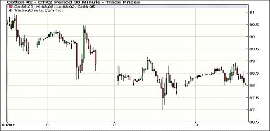 3月13日,市場消息平平,紐約期棉多跌少漲延續(xù)弱勢,主力合約結(jié)束五連跌微幅報(bào)漲,當(dāng)日結(jié)算價(jià)為88.04美分/磅,漲4點(diǎn);7月合約結(jié)算價(jià)88.80美分/磅,跌13點(diǎn)。當(dāng)日市場開盤后受買盤支持震蕩走高,后賣盤涌入打壓期棉迅速走低,主力合約至當(dāng)日最低點(diǎn)87.94美分/磅;這一價(jià)位吸引買盤再次介入,推動(dòng)期棉反彈,該合約最高至88.93美分/磅;尾盤時(shí)買盤獲利回吐部分漲幅,盤終該合約微幅收漲,其他合約漲跌互現(xiàn)。遠(yuǎn)期1212月合約仍收于90美分之下。幾周以來,棉花市場一直在略低于88美分至94美分之間區(qū)間震蕩,一旦棉花價(jià)格跌至88美分以下,總會(huì)有消費(fèi)者買盤出現(xiàn)。當(dāng)日主力合約在買盤支持下弱勢告漲。