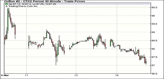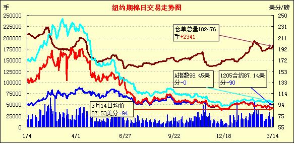 3月14日,紐約期棉在賣盤打壓下全面收跌,主力5月合約結(jié)算價(jià)為87.14美分/磅,跌90點(diǎn);7月合約結(jié)算價(jià)87.76美分/磅,跌104點(diǎn);其他遠(yuǎn)期合約跌幅30-112點(diǎn)不等。當(dāng)日市場(chǎng)高開低走,基本面消費(fèi)不佳引發(fā)賣盤涌入,主力合約當(dāng)日最低至87.05美分/磅;尾盤時(shí)略有反彈回補(bǔ)部分跌幅,盤終前五份合約跌幅較大,其他遠(yuǎn)期合約中幅收跌。當(dāng)日外部商品市場(chǎng)漲跌互現(xiàn),大豆及小麥期貨走高,玉米及原油市場(chǎng)下跌。基本面利空繼續(xù)對(duì)期棉形成打壓,引發(fā)投資者賣盤,市場(chǎng)持續(xù)走低。但預(yù)計(jì)主力跌至87美分之下,將會(huì)吸引買家逢低買入。此外,美國(guó)農(nóng)業(yè)部(USDA)將于今日晚公布上周美棉出口周報(bào),市場(chǎng)期待其進(jìn)一步指引。