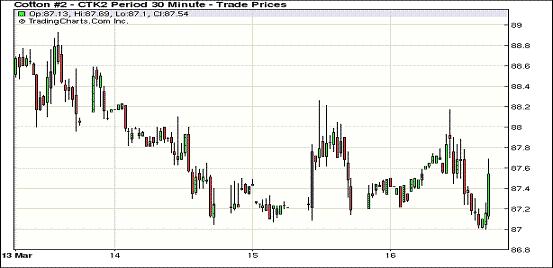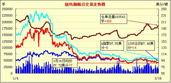 3月16日美元走低、外部谷物及油料市場全面走高,紐約期棉漲跌互現(xiàn),但都在90美分下線震蕩。主力5月合約結(jié)算價87.48美分/磅,漲14點,7月合約收于88.05美分/磅,漲4點。市場成交仍較為溫和。當日主力合約早盤在買盤支持下震蕩走高,最高至88.17美分/磅;午盤后賣盤涌入打壓市場回落,該合約下行至當日最低點后87.00美分/磅;尾盤時買盤再次介入促市場反彈,盤終該合約小幅收漲。3.11-3.15日當周5月合約累計跌幅132點,7月合約跌169點,12月合約跌208點。目前期棉市場處于較低價位,吸引投資者逢低買入,紐約期棉主力連續(xù)兩日收漲。
