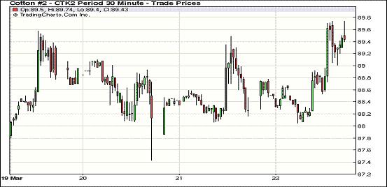 3月22日,受美棉出口周報數(shù)據(jù)利好支持,紐約期棉全面上漲,主力5月合約結算價為89.58美分/磅,漲127點;7月合約結算價90.23美分/磅,漲115點,其他遠期合約漲幅34-84點不等。成交量與前一日基本持平。當日市場開盤短暫走高后震蕩回落,主力5月合約當日最低至88.05美分/磅;后美棉出口周報利好推動期棉迅速走高,該合約最高至89.74美分/磅,震蕩幅度169點;尾盤時略有回落回吐部分漲幅,盤終收漲100余點。當日外部市場漲跌不一。據(jù)美國農(nóng)業(yè)部(USDA),3.9 -3.15一周美國凈簽約出口本年度陸地棉44679噸(較近四周平均值增30%),裝運67381噸(較前周減19%,較近四周平均值減13%),此數(shù)據(jù)表現(xiàn)利好推動期棉強勢走高。