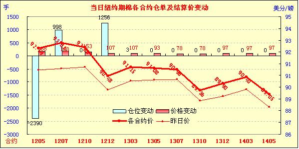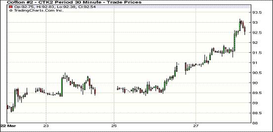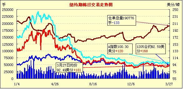 3月27日技術(shù)及投機買盤表現(xiàn)活躍促紐約期棉再次全面走高,主力5月合約結(jié)算價為92.59美分/磅,漲168點;7月合約結(jié)算價93.01美分/磅,漲198點,其他遠期合約漲幅78-153點不等。成交量突破三萬手,較前幾日大幅增加。當日期棉小幅高開后在外部商品市場走高支持下震蕩上揚,主力合約午盤前后圍繞91.50美分窄幅波動,交易后段買盤入市促市場再次走高,該合約最高至93.18美分/磅,震蕩幅度277點;尾盤時略有回落回吐部分漲幅,盤終該合約收于2月21日以來最高點。遠期1212月合約尚未突破90美分,當日收于89.90美分/磅。本周技術(shù)及投機買盤活躍,推動期棉連續(xù)兩個交易日走高。此外,近期美棉銷售活躍引發(fā)市場擔心未來幾周供應(yīng)吃緊,這也是刺激投機買盤入市的主要原因。