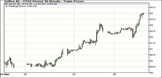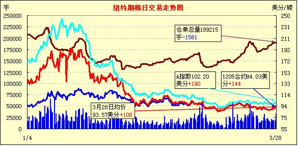 3月28日,在投機(jī)基金買盤推動下,紐約期棉前兩份合約大幅上揚(yáng),主力5月合約結(jié)算價為94.03美分/磅,漲144點(diǎn);7月合約結(jié)算價93.93美分/磅,漲92點(diǎn),其他遠(yuǎn)期合約也普遍小幅收漲。成交量持續(xù)處于近期高位。當(dāng)日期棉小幅低開,雖然外部商品市場及股市普遍走低,但期棉獨(dú)力上行,早盤圍繞92.5美分窄幅震蕩;午盤后投機(jī)基金買盤發(fā)力,促市場再次走高,主力合約最高至94.08美分/磅;尾盤略有回落,盤終該合約收于近兩個月高位。盤面上各合約除1310外,均收于90美分之上。近月合約供應(yīng)吃緊促投機(jī)買盤表現(xiàn)活躍,此外市場對美棉需求穩(wěn)定,推動近月合約連續(xù)大幅上漲。美國農(nóng)業(yè)部將于今晚公布最新出口周報,市場期待進(jìn)一步指引。