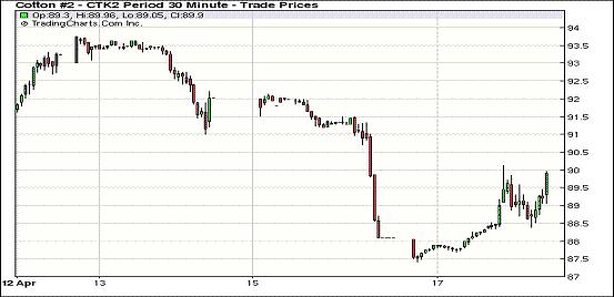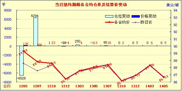 4月17日,紐約期棉市場在外部商品市場回暖帶動下絕大多數(shù)合約收漲,近期5月合約結(jié)算價89.43美分/磅,漲135點,1207月合約88.25美分,漲100點,1212月合約86.33美分,跌4點,其他合約漲幅多在20點以下。當(dāng)日市場平穩(wěn)開盤后重心逐步上移,盤中小幅走高,交易后期美元下跌刺激商品市場整體走強,期棉漲幅擴大,多數(shù)合約漲幅過百點,交易尾段多數(shù)合約以上漲報收。5月合約轉(zhuǎn)倉交易活躍,成交量維持高位。前一個交易日期貨市場大跌吸引了現(xiàn)貨買家采購美棉,對昨日市場形成支持。另外,日前中國人民銀行宣布自2012年4月16日起銀行間即期外匯市場人民幣兌美元交易價浮動幅度由5‰擴大至1%,短期內(nèi)對棉花和其他商品市場沒有影響,但長期看對中國進(jìn)口棉花有利,對美棉出口是利多的。