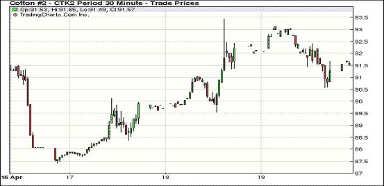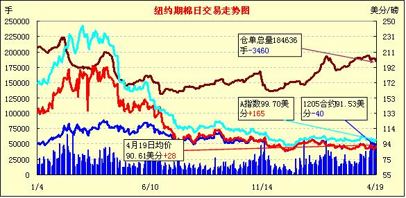 4月19日,受外部谷物市場(chǎng)普遍走高支持,紐約期棉除近期5月合約外收跌外,其他合約繼續(xù)收高,盤終5月合約結(jié)算價(jià)91.53美分/磅,跌40點(diǎn),主力7月合約90.72美分/磅,漲70點(diǎn),其他遠(yuǎn)期合約也普遍大幅收漲。當(dāng)日5月合約大幅低開(kāi),后在外部商品市場(chǎng)走高支持下沖高至93.11美分/磅,由于其下周進(jìn)入第一交個(gè)通知日,投資者結(jié)清頭寸轉(zhuǎn)向遠(yuǎn)月合約,這導(dǎo)致交易后段該合約持續(xù)下跌并以小跌收盤;主力7月合約最高至91.41美分/磅,盤終收于90美分之上。當(dāng)日大豆、玉米及小麥合約普遍走高。據(jù)美國(guó)農(nóng)業(yè)部(USDA),4.6-4.12一周美國(guó)凈簽約出口本年度陸地棉負(fù)的885噸,裝運(yùn)59398噸,這符合市場(chǎng)預(yù)期,對(duì)期棉市場(chǎng)影響不大。