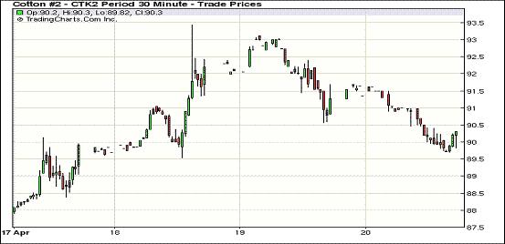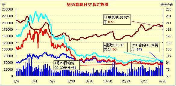 4月20日,紐約期棉漲跌互現(xiàn),近期5月合約結(jié)算價(jià)90.04美分/磅,跌149點(diǎn),7月合約收于91.01美分/磅,漲29點(diǎn),12月合約88.28美分/磅,跌3點(diǎn)。市場(chǎng)在周末前交投淡靜,交易量較前幾日明顯縮減。當(dāng)日市場(chǎng)開(kāi)盤(pán)后震蕩走低,5月合約在投機(jī)賣盤(pán)打壓下最低至89.70美分/磅,交易后期雖略有反彈,盤(pán)終仍大跌100余點(diǎn)。由于該合約下周二進(jìn)入第一交割通知日,投資者轉(zhuǎn)倉(cāng)活躍,推高7月及10月合約。其他遠(yuǎn)期合約小幅收跌或持穩(wěn)。