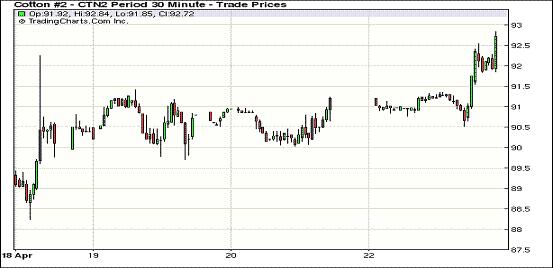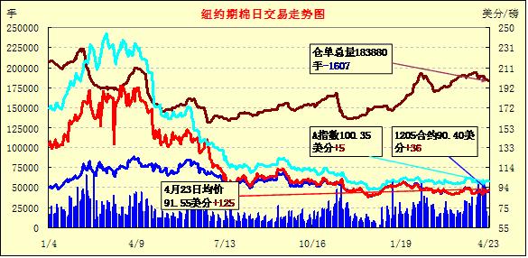 4月23日,盡管外部商品市場(chǎng)多數(shù)收跌,但紐約期棉在投資者買盤支持下全面收漲,5月合約結(jié)算價(jià)90.40美分/磅,漲36點(diǎn),主力7月合約92.48美分/磅,漲147點(diǎn),遠(yuǎn)期12月合約89.30美分/磅,漲102點(diǎn)。當(dāng)日市場(chǎng)平穩(wěn)開盤,近期5月合約早盤沖高回落,最低至89.30美分/磅,午盤后在買盤支持下重新上揚(yáng)并以上漲收盤;7月合約前半場(chǎng)圍繞91美分震蕩,后受買盤支持上行至當(dāng)日最高點(diǎn)92.84美分/磅,尾盤時(shí)雖略有回落,但仍收于三周以來(lái)高位;12月合約也大幅上漲,但尚未突破90美分。5月合約今日將進(jìn)入第一交個(gè)通知日。當(dāng)前美棉良好的出口簽約率、較低的庫(kù)存及植棉面積下降有利于期棉反彈,中國(guó)宣布降低海關(guān)關(guān)稅也對(duì)美棉出口形成利好支持,預(yù)計(jì)短期將延續(xù)反彈格局。