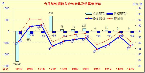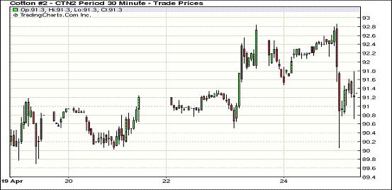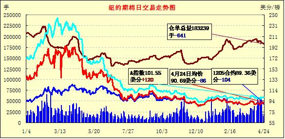 4月24日,在獲利平倉盤的打壓下,紐約期棉全面收跌,5月合約結(jié)算價89.36美分/磅,跌104點,主力7月合約91.46美分/磅,跌102點,遠期12月合約88.71美分/磅,跌59點。當日主力7月合約小幅低開后震蕩上揚,交易上半場在92-92.5美分區(qū)間震蕩,午盤后至當日最高點92.86美分/磅,后賣盤涌入打壓市場快速走低,該合約最低至90.05美分/磅,震蕩幅度281點,尾盤雖略有反彈但終收跌百余點。當日為5月合約的第一交個通知日,尚有為平倉合約299張。其他遠期合約也普遍大幅下跌。