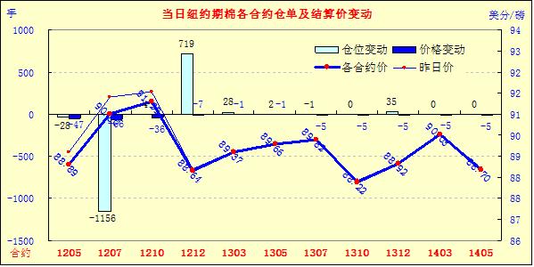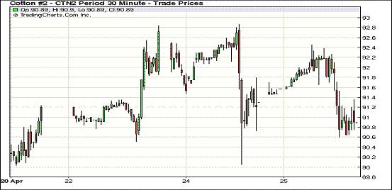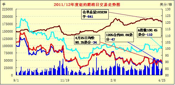 4月25日,紐約期棉延續(xù)前一日的跌勢繼續(xù)收低,近期5月合約結算價88.89美分/磅,跌47點,主力7月合約90.80美分/磅,跌66點,遠期12月合約88.64美分/磅,跌7點。當日市場較為平淡,成交量較前幾日明顯縮減。當日期棉開盤后震蕩走高,主力7月合約最高至92.45美分/磅;午盤后受賣盤打壓回落,當日最低至90.60美分/磅,震蕩幅度185點;尾盤時雖略有反彈回補部分跌幅,但終以陰跌收盤。遠期12月合約當日最高至89.55美分/磅,盤終微幅收跌。當日外部商品市場漲跌不一,大豆及原油期貨收漲,小麥及玉米告跌。