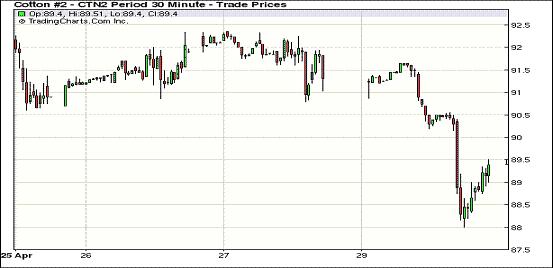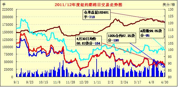 4月30日,受印度恢復(fù)棉花出口消息的影響,紐約期棉大幅收跌,跌至年內(nèi)低點(diǎn),近期5月合約結(jié)算價(jià)87.25美分/磅,跌198點(diǎn),主力7月合約89.40美分/磅,跌183點(diǎn),12月合約86.96美分/磅,跌94點(diǎn)。成交量較上周大幅增加。因預(yù)期當(dāng)日的印度政府會(huì)議對(duì)棉花市場(chǎng)利空,市場(chǎng)開盤后持續(xù)走低,后印度消息公布及德州降雨進(jìn)一步使期棉承壓,當(dāng)日主力7月合約最低至87.87美分/磅,12月合約最低至85.40美分/磅,尾盤時(shí)雖略有反彈回補(bǔ)部分跌幅,但終以大跌收盤。印度允許無限制出口棉花,這令全面棉花供應(yīng)進(jìn)一步增加,給7月合約帶來沉重壓力。