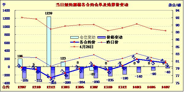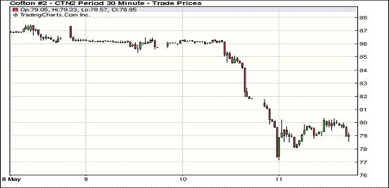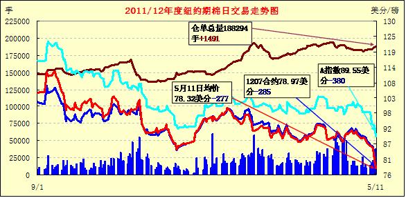5月11日美元走高、外部商品市場全面走低,同時(shí)美國農(nóng)業(yè)部報(bào)告利空及美國主產(chǎn)棉區(qū)天氣情況得到改善繼續(xù)對期棉形成壓力,在上述因素打壓下紐約期棉繼續(xù)大幅走低,主力7月合約結(jié)算價(jià)78.97美分/磅,跌285點(diǎn),遠(yuǎn)期12月合約76.34美分/磅,跌303點(diǎn)。投資者表現(xiàn)活躍,當(dāng)日市場成交超過4萬手。當(dāng)日期棉大幅走低,主力合約最低至77.16美分/磅,盤中雖短暫反彈至80美分之上,但仍以大跌收盤,收于2010年9月以來最低點(diǎn)。遠(yuǎn)期12月合約繼續(xù)處于2010年12月以來最低點(diǎn)。當(dāng)周主力7月合約累計(jì)跌9.02美分,12月合約累計(jì)跌9.46美分。當(dāng)周美國主產(chǎn)棉區(qū)德州持續(xù)降雨,這有利于改善土壤濕度及新花生長,但對期棉形成壓力,此外美國農(nóng)業(yè)部的全球棉花供需報(bào)告利空繼續(xù)打壓棉價(jià)下行。