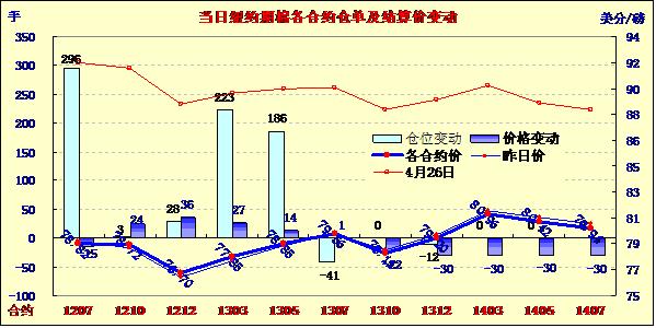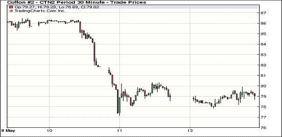 5月14日美元走強、外部商品市場多數(shù)收跌,同時市場圍繞歐債危機的憂慮加深,但投機買盤在一定程度上對期棉形成支持,當(dāng)日紐約期棉漲跌互現(xiàn),主力7月合約收于78.82美分/磅,跌15點,遠(yuǎn)期12月合約76.70美分/磅,漲36點。當(dāng)日主力合約波幅較大,開盤后延續(xù)前幾日跌勢至當(dāng)日最低點77.85美分/磅,此低位吸引投機買盤入市,促該合約震蕩上行,盤中最高至79.90美分/磅,仍為能突破80美分關(guān)鍵阻力位;盤終該合約微幅下跌。12月合約小幅反彈。