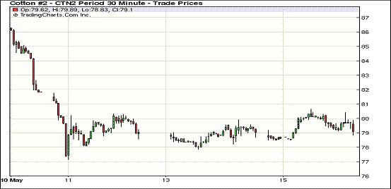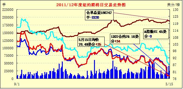 5月15日在投機(jī)買盤的支持下,紐約期棉主力合約自5月1日以來首次上揚(yáng),當(dāng)日收于79.16美分/磅,漲34點,12月合約77.33美分/磅,漲63點,其他遠(yuǎn)期合約漲幅68-102點不等。當(dāng)日市場開盤后震蕩走高,主力合約早盤突破80美分阻力位,最高至80.65美分/磅,交易后段該合約回落回吐部分漲幅,盤終小幅收漲。當(dāng)日外部谷物市場普遍漲幅較大,原油市場收跌。期棉自5月以來持續(xù)下跌,跌幅約9-10美分,目前的低位吸引了投機(jī)買盤涌入,促市場止跌反彈。