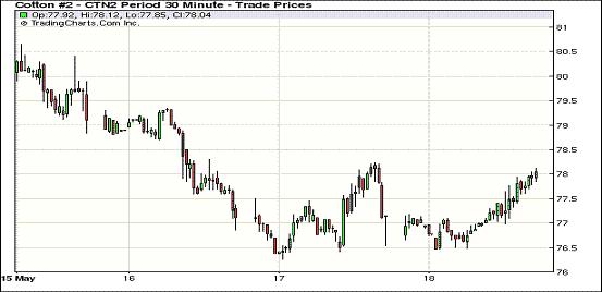 5月18日在空頭獲利平倉盤的支持下,紐約期棉一改5月份以來的弱勢大幅上揚,主力7月合約結(jié)算價77.99美分/磅,漲134點,12月合約75.21美分/磅,漲131點,其他遠(yuǎn)期合約也普遍大幅收漲。當(dāng)日市場小幅高開,主力合約開盤后略有回落,后在買盤的支持下持續(xù)震蕩上揚并以大漲收盤。該合約本周較上周跌98點。當(dāng)日外部市場漲跌不一,小麥機(jī)玉米期貨走高,大豆及原油市場走弱。自5月份以來,期棉持續(xù)下跌,累計跌幅超過11美分。17日,主力合約收于近兩年新低,市場處于超賣狀態(tài),昨日貿(mào)易商低位平倉,促使期棉大幅反彈。