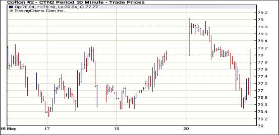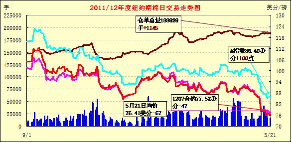 5月21日,在賣盤打壓下,紐約期棉多數(shù)合約收低,主力7月合約結(jié)算價77.52美分/磅,跌47點(diǎn),遠(yuǎn)期12月合約76.67美分/磅,跌30點(diǎn)。當(dāng)日市場平穩(wěn)開盤,主力合約短暫走高至當(dāng)日最高點(diǎn)79.05美分/磅;后賣盤涌入打壓該合約持續(xù)走低,當(dāng)日最低至76.49美分/磅,較上周五最低點(diǎn)僅高出0.02美分,震蕩幅度256點(diǎn);尾盤時雖有所反彈,但終以陰跌收盤。當(dāng)日外部股市及商品市場表現(xiàn)較為強(qiáng)勁。五月以來紐約期棉持續(xù)下跌,低棉價吸引投機(jī)性買盤引發(fā)一波為期較短的反彈,但目前基本面上無利好消息,歐債危機(jī)憂慮仍對市場造成下行壓力,預(yù)計(jì)期棉短期仍保持弱勢。
