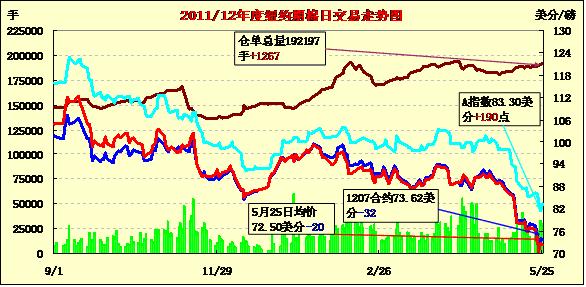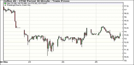5月25日,外部商品市場普遍走高,紐約期棉漲跌互現(xiàn),主力7月合約結(jié)算價(jià)73.62美分/磅,跌32點(diǎn),12月合約70.89美分/磅,漲22點(diǎn)。5月29日(下周一)期棉休市一天,投資者在小長假前表現(xiàn)謹(jǐn)慎,交易量較前幾日有所回落。當(dāng)日期棉早盤在外部商品市場走強(qiáng)的支持下震蕩走高,主力合約最高至74.76美分/磅;后賣盤涌入打壓該合約下行,當(dāng)日最低至72.65美分/磅;尾盤時(shí)反彈回補(bǔ)部分跌幅,但終以陰跌收盤。近期市場持續(xù)下跌,歐債危機(jī)前景不明可能繼續(xù)對期棉施壓,市場密切關(guān)注歐洲局勢的發(fā)展情況。