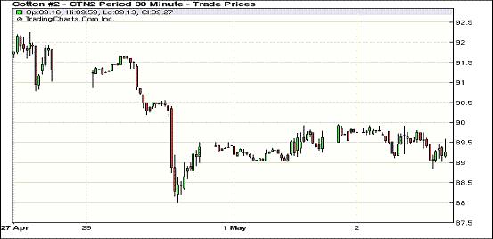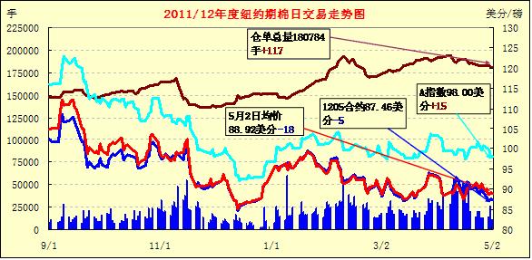 5月2日,受美元走強(qiáng)、外圍股市及商品市場整體走低影響,紐約期棉前四份合約小幅收跌,其他遠(yuǎn)期合約在套利買盤支持下普遍上揚。主力7月合約結(jié)算價89.51美分/磅,跌17點,遠(yuǎn)期12月合約86.58美分/磅,跌36點。當(dāng)日主力合約小幅低開,早盤在買盤支持下最高至89.94美分/磅,與前一日高點基本持平;后在外圍商品市場走低拖累及套利賣盤打壓下走低并終以陰跌收盤。遠(yuǎn)期12月合約整體運行較為平穩(wěn),與7月合約價差為293點。當(dāng)日外部谷物及原油市場全面下挫。昨日期棉基本延續(xù)前一日的格局橫盤整理,市場期待美棉出口周報的進(jìn)一步指引。