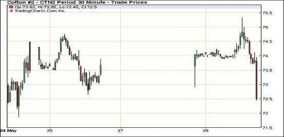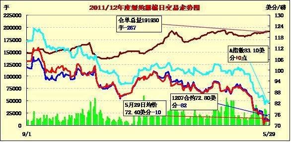5月29日,紐約期棉漲跌互現,主力7月合約結算價72.80美分/磅,跌82點,遠期12月合約71.30美分/磅,漲41點。投資者在小長假后表現較為活躍,成交量約3.5萬手。當日市場平穩(wěn)開盤,主力7月合約上半場圍繞74美分窄幅震蕩;午盤時分買盤發(fā)力促該合約震蕩上行并突破75美分,當日最高至75.33美分/磅;然美元走強及外部市場走低對市場形成拖累,投機性賣盤在尾盤涌入打壓該合約回落并終以陰跌收盤。12月合約當日中幅收漲。市場圍繞希臘將繼續(xù)留在歐元區(qū)的樂觀情緒升溫,但西班牙債務問題又引發(fā)擔憂,一個月內第三次下調西班牙信用評級,歐洲危機解決進程仍不容樂觀,這對全球商品市場形成打壓。此外,棉花基本面持續(xù)疲軟,投機性買賣盤相互角力,導致期棉主力當日沖高回落。