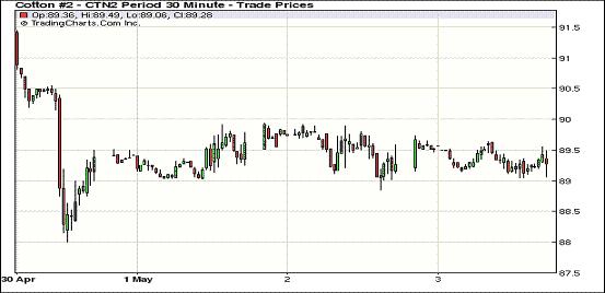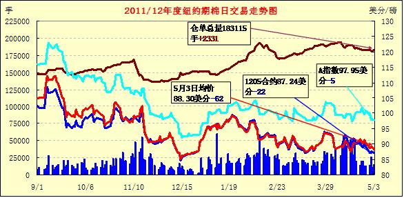 5月3日,美棉出口重現(xiàn)負(fù)值,紐約期棉受打壓繼續(xù)走低,主力7月合約連續(xù)第五個(gè)交易日收跌,當(dāng)日結(jié)算價(jià)87.24美分/磅,跌22點(diǎn),遠(yuǎn)期12月合約86.52美分/磅,跌6點(diǎn)。部分投資者轉(zhuǎn)持觀望態(tài)度,市場交易較為清淡。當(dāng)日主力合約早盤沖高至當(dāng)日最高點(diǎn)89.74美分/磅,后受賣盤打壓回落,盤中最低至89.05美分/磅,尾盤略有反彈但終以陰跌收盤。該合約自4月27日以來運(yùn)行于90美分之下。遠(yuǎn)期12月合約繼續(xù)橫盤整理,震蕩幅度79點(diǎn)。當(dāng)日外部市場漲跌不一,大豆及原油市場走低,小麥及玉米收高。據(jù)美國農(nóng)業(yè)部(USDA),4.20-4.26一周美國凈簽約出口本年度陸地棉負(fù)的5715噸,裝運(yùn)72711噸(較前周增17%,較近四周平均值增14%)。分析師指出,美棉出口為負(fù)導(dǎo)致期棉市場繼續(xù)承壓,市場關(guān)注美國農(nóng)業(yè)部將于10日公布的供需預(yù)測報(bào)告。