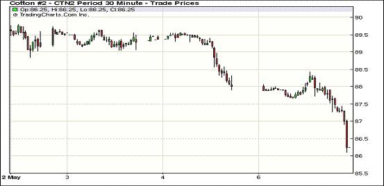 5月7日,受投機(jī)性賣盤打壓,紐約期棉延續(xù)上周的弱勢繼續(xù)下跌,主力7月合約收于12月下旬以來最低位,當(dāng)日結(jié)算價(jià)86.67美分/磅,跌132點(diǎn),遠(yuǎn)期12月合約84.73美分/磅,跌107點(diǎn)。當(dāng)日市場開盤后震蕩走高,主力合約早盤至當(dāng)日最高點(diǎn)88.42美分/磅,后美元走強(qiáng)及外圍商品市場走弱拖累期棉下行,該合約下探至支撐位86.55美分后遭遇更多賣盤,尾盤時(shí)分至最低點(diǎn)86.10美分/磅,盤終前略有反彈但終以大跌收盤。遠(yuǎn)期12月合約當(dāng)日最低至84.26美分/磅,為去年12月中旬以來最低點(diǎn)。棉花基本面持續(xù)疲軟;上周印度政府宣布放開棉花出口,這令國際市場上棉花供應(yīng)量增加,對期棉造成更多壓力。各方密切關(guān)注美國農(nóng)業(yè)部(USDA)將于10日公布的全球棉花供需預(yù)測報(bào)告。