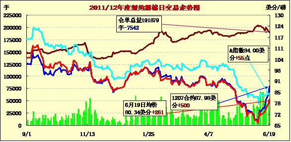 6月19日,受美國(guó)經(jīng)濟(jì)方面消息刺激,美國(guó)股市和外部商品市場(chǎng)整體收漲,期棉一并受益破位上漲,近期7月合約結(jié)算價(jià)87.98美分/磅,收高于500點(diǎn)漲停板,主力12月合約突破關(guān)鍵阻力位73美分,結(jié)算價(jià)74.43美分,漲257點(diǎn)。當(dāng)日市場(chǎng)整體高開(kāi),7月合約盤中一直穩(wěn)于85美分以上,交易后期沖向漲停,終封于漲停板;12月合約穩(wěn)定開(kāi)盤后穩(wěn)于72美分以上,在突破73美分后觸發(fā)止損買單促市場(chǎng)進(jìn)一步上漲,盤中高位距離75美分僅約20點(diǎn),交易后期高位徘徊,終收于近高點(diǎn)。當(dāng)日美國(guó)公布的經(jīng)濟(jì)數(shù)據(jù)顯示,美國(guó)5月新屋開(kāi)建數(shù)量下降,但營(yíng)建許可量創(chuàng)多年新高;另外美聯(lián)儲(chǔ)開(kāi)始考慮是否采取進(jìn)一步刺激經(jīng)濟(jì)增長(zhǎng)措施,對(duì)整體商品市場(chǎng)形成支持。7月合約即將進(jìn)入交割期,但多單勢(shì)頭更勝于空單,促該合約連現(xiàn)漲停,商業(yè)性多單并無(wú)減倉(cāng)跡象,而投機(jī)商和倉(cāng)單持有者擁有大量空單。技術(shù)面上看,12月合約經(jīng)過(guò)幾日連續(xù)上漲更顯穩(wěn)固,下一步阻力位為77.35、81.2和85.05美分。