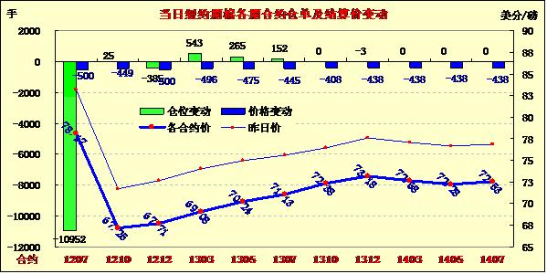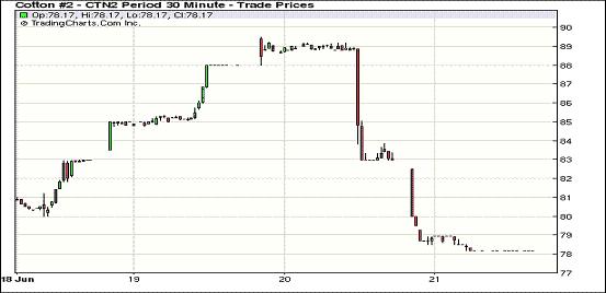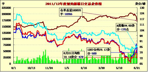 6月21日,因全球經(jīng)濟(jì)數(shù)據(jù)疲軟引發(fā)避險(xiǎn)需求,美元大漲,外部商品市場整體走低,紐約期棉也難逃此劫繼續(xù)大幅收跌,近期7月合約結(jié)算價(jià)78.17美分/磅,跌500點(diǎn),12月合約67.71美分/磅,跌500點(diǎn),其他合約跌幅普遍在400點(diǎn)以上。當(dāng)日市場小幅低開,近期7月合約即將進(jìn)入交割期,其早盤即受投機(jī)賣盤打壓跌至跌停板并延續(xù)至盤終;主力12月合約早盤平穩(wěn)運(yùn)行在70美分之上,美棉出口周報(bào)下年度棉花簽約量大增并未對其形成明顯支持,該合約在午盤后受外部市場壓力大幅走低,尾盤時(shí)分至跌停板并以跌停收盤。美國一周初請失業(yè)金數(shù)據(jù)暗示就業(yè)市場仍舊走勢掙扎,另外美國制造業(yè)走疲和全球產(chǎn)出走軟的信號(hào),加劇了避險(xiǎn)操作導(dǎo)致美元走高。穆迪下調(diào)大批涉足全球資本市場業(yè)務(wù)的銀行及證券公司評(píng)級(jí),反映了經(jīng)濟(jì)形勢下滑的危險(xiǎn)。此外,油價(jià)失守80美元,下跌4%,收于78.2美元,為去年10月份來首次。美股大幅下挫,創(chuàng)年內(nèi)第二大單日跌幅。
