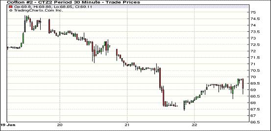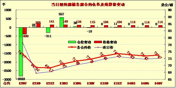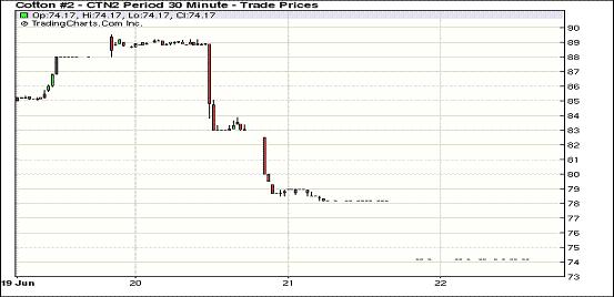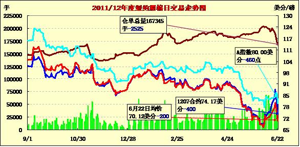 6月22日美元走低、外部商品市場整體上揚(yáng),紐約期棉除近期7月合約跌停外,其他合約普遍大幅上漲。7月合約結(jié)算價74.17美分/磅,跌400點,12月合約69.12美分/磅,漲141點。當(dāng)日主力12月合約開盤后震蕩上揚(yáng),盤中最低至67.38美分/磅,后在外圍市場帶動下反彈并收漲。近期7月合約一路走低,投機(jī)多頭普遍要在交割期前結(jié)清頭寸,導(dǎo)致該合約再次收于跌停。當(dāng)日為該合約第一交割通知日(6月25日)前的最后一個交易日,尚有未平倉合約3448張。7/12月合約價差5.05美分,價差交易仍舊活躍。