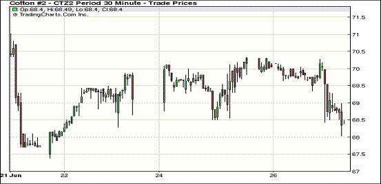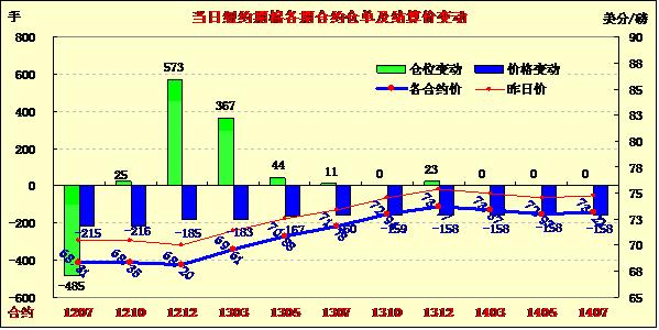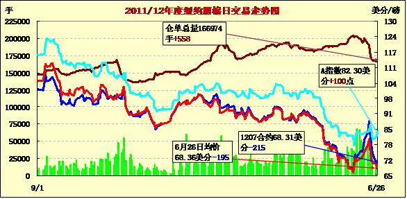 6月26日,紐約期棉市場(chǎng)受歐債危機(jī)影響及相關(guān)期權(quán)交易打壓,市場(chǎng)全面下跌,前兩份合約收跌二百余點(diǎn),其他合約收跌158-185點(diǎn)不等,主力12月合約結(jié)算價(jià)68.20美分/磅,跌185點(diǎn)。當(dāng)日12月合約窄幅開盤,早盤在70美分上下波動(dòng),盤中試圖站穩(wěn)于70美分挑戰(zhàn)失敗,后下跌到69美分以下,交易后期在68-69美分區(qū)間波動(dòng),最終大幅收跌。有交易商通過期權(quán)進(jìn)行套期保值,看跌期權(quán)交易多于看漲期權(quán),對(duì)市場(chǎng)形成壓力。分析師指出,12月合約跌回70美分以下,技術(shù)面將在64美分尋找支撐。歐洲方面,德國總理默克爾對(duì)其所在的執(zhí)政聯(lián)盟內(nèi)的政治家表示其堅(jiān)決反對(duì)歐洲共同承擔(dān)總債務(wù)責(zé)任。另有投資者稱,穆迪投資者服務(wù)機(jī)構(gòu)正計(jì)劃將西班牙的主權(quán)評(píng)級(jí)下調(diào)至“垃圾級(jí)”。在此以前,投資者已將西班牙最大型銀行和公司的違約保險(xiǎn)成本推升至接近于歷史最高水平。
