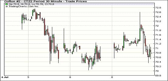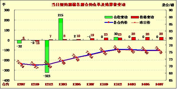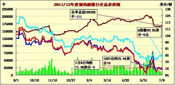 7月9日,受少量投機(jī)性買盤支持,紐約期棉除近期10月合約外普遍小幅上漲,主力12月合約結(jié)算價(jià)70.69美分/磅,漲7點(diǎn)。市場(chǎng)成交持續(xù)在低位徘徊。當(dāng)日主力合約近三周以來(lái)在67-75美分區(qū)間震蕩,昨日小幅高開,早盤基本運(yùn)行在71.2美分之上,盤中受投機(jī)性買盤支持至當(dāng)日最高點(diǎn)72.60美分/磅,后買盤獲利平倉(cāng)導(dǎo)致該合約回落,盤終微幅收漲。當(dāng)日外部谷物商品市場(chǎng)受天氣因素影響大幅收漲,原油期貨也大幅上揚(yáng)。當(dāng)日為近期7月合約的最后交易日,該合約發(fā)出120張通知單,尚有未平倉(cāng)合約311張。市場(chǎng)密切關(guān)注美國(guó)農(nóng)業(yè)部將于11日公布的7月份全球棉花供需預(yù)測(cè)報(bào)告,投資者在報(bào)告公布前調(diào)整頭寸,市場(chǎng)成交清淡。