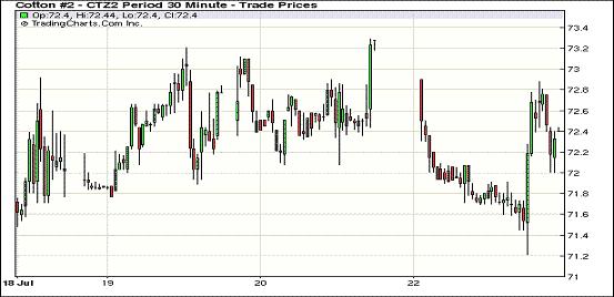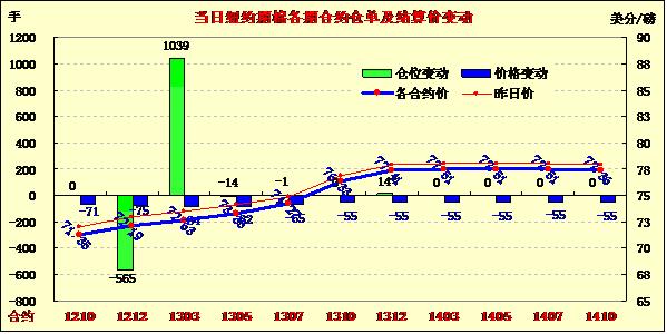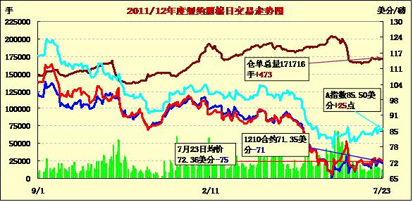 7月23日,因圍繞歐債危機(jī)的擔(dān)憂重燃,美元走高、美股及商品市場全面走低,紐約期棉同樣受累結(jié)束上周三連漲的局面整體收跌,近期10月合約結(jié)算價(jià)71.35美分/磅,跌71點(diǎn);主力12月合約結(jié)算價(jià)72.19美分/磅,跌75點(diǎn)。當(dāng)日市場小幅低開,受歐債擔(dān)憂拖累,主力12月合約交易前半場震蕩下行,午盤后至當(dāng)日最低點(diǎn)71.21美分/磅(-173點(diǎn)),此低點(diǎn)吸引投機(jī)買盤入市,促該合約反彈回補(bǔ)部分跌幅,盤終中幅收跌。12/3月合約價(jià)差縮小至44點(diǎn),較前一個(gè)交易日減9點(diǎn)。西班牙又有六個(gè)地區(qū)可能會(huì)請求中央政府給予援助,消息引發(fā)市場人士對西班牙可能需要全面救助的擔(dān)憂升溫;同時(shí)希臘面臨新的債務(wù)問題,圍繞歐洲未來狀況的不確定性引發(fā)金融市場陷入極度緊張之中,歐元兌美元?jiǎng)?chuàng)兩年新低,美股及商品市場全線走低。
