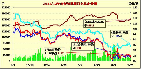 7月26日,雖然外部谷物市場(chǎng)普遍大幅下跌,但紐約期棉受美元走低、印度旱情及商業(yè)買盤支持反彈收高,近期10月合約結(jié)算價(jià)70.68美分/磅,漲158點(diǎn);主力12月合約結(jié)算價(jià)71.39美分/磅,漲188點(diǎn);其他遠(yuǎn)期合約漲幅146-177點(diǎn)不等。當(dāng)日市場(chǎng)小幅高開(kāi),受上周美棉出口數(shù)據(jù)低迷影響,主力合約早盤在70-70.4美分之間窄幅震蕩,午盤前后一波商業(yè)買盤入市促市場(chǎng)短暫走高后又震蕩回落;尾盤時(shí)分印度旱情及美元走低刺激市場(chǎng)迅速上揚(yáng),該合約盤終大幅收漲。12/3月合約價(jià)差78點(diǎn),較前一日減11點(diǎn)。當(dāng)日美元走低及股市走高,同時(shí)作為全球第二大產(chǎn)棉國(guó)的印度出現(xiàn)旱情,其主產(chǎn)棉區(qū)古吉拉特西部季風(fēng)降雨量同比減幅達(dá)97%,此外商業(yè)買盤在期棉持續(xù)三日下跌后入市,這些因素促使期棉市場(chǎng)當(dāng)日強(qiáng)勢(shì)反彈。