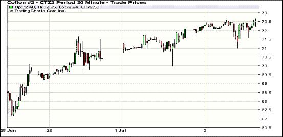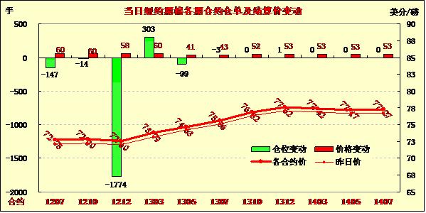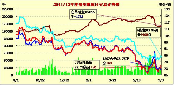 7月3日,國際棉花咨詢委員會(ICAC)最新預(yù)測下年度棉花期末庫存消費比達(dá)近30年最高,同時外圍商品市場普遍強勢上揚,紐約期棉受上述因素提振實現(xiàn)四連漲,主力12月合約結(jié)算價72.60美分/磅,漲58點。其他合約漲幅41-60點不等。4日期棉市場休市一天,投資者在假期前表現(xiàn)淡靜。當(dāng)日市場小幅高開,主力合約受ICAC預(yù)測報告利好支持震蕩上揚,早盤至近9個交易日最高點72.65美分/磅;午盤后賣盤涌入打壓市場快速走低,該合約最低至71.00美分/磅,震蕩幅度165點;后外圍市場走高帶動期棉反彈,盤終該合約連續(xù)第四個交易日收漲。ICAC最新預(yù)測本年度全球棉花總產(chǎn)2716萬噸,較上次預(yù)測調(diào)增5萬;消費2274萬調(diào)減37萬;期末庫存1379萬增52萬。下年度期末庫存達(dá)1513萬噸,庫存消費比達(dá)64%,為上世紀(jì)80年代中期以來最高值。外圍谷物市場受天氣因素影響強勢上揚,這對期棉市場也構(gòu)成提振。此外,市場預(yù)計疲軟的經(jīng)濟數(shù)據(jù)將引發(fā)全球主要央行進(jìn)一步推出刺激性貨幣政策,這對商品市場整體形成利好支持。