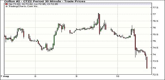8月10日,因美國(guó)農(nóng)業(yè)部(USDA)最新預(yù)測(cè)報(bào)告將全球棉花期末庫存上調(diào)至記錄新高,紐約期棉承壓大幅下跌,近期10月合約結(jié)算價(jià)72.90美分/磅,跌269點(diǎn);主力12月合約結(jié)算價(jià)73.02美分/磅,跌293點(diǎn);其他遠(yuǎn)期合約跌幅也普遍在200點(diǎn)以上。當(dāng)日市場(chǎng)平穩(wěn)開盤,主力12月合約早盤圍繞75.50美分/磅上下波動(dòng),后USDA報(bào)告利空打壓期棉大幅回落,該合約盤中觸及跌停板,后雖略有反彈回補(bǔ)部分跌幅,但盤終仍錄得兩個(gè)月以來最大單日跌幅。當(dāng)日外部商品市場(chǎng)除大豆走高外,其他也普遍走低。預(yù)計(jì)全球期末庫存1626萬噸,較上次預(yù)測(cè)調(diào)增50萬噸,為歷史新高,這打壓期棉在當(dāng)日大幅回落。
