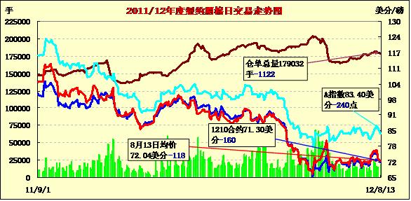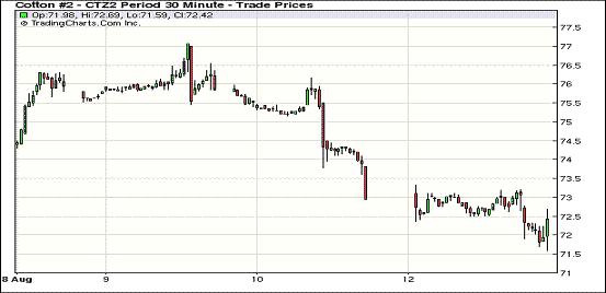 8月13日,在市場擔(dān)憂全球需求前景不佳、技術(shù)性賣盤及外部商品市場大跌的共同作用下,ICE期棉延續(xù)前一個交易日的跌勢繼續(xù)走低,近期10月合約結(jié)算價71.30美分/磅,跌160點(diǎn);主力12月合約結(jié)算價71.69美分/磅,跌133點(diǎn)。當(dāng)日主力12月合約早盤在72.8美分/磅上下波動,當(dāng)日最高至73.33美分/磅;后技術(shù)性賣盤入市拖累市場大幅下跌,該合約最低至71.69美分/磅,震蕩幅度174點(diǎn);尾盤時略有反彈回補(bǔ)部分跌幅,盤終仍大幅收跌。當(dāng)日外部商品市場也普遍大幅走低。上周美國農(nóng)業(yè)部(USDA)報告調(diào)高全球棉花產(chǎn)量及期末庫存,同時消費(fèi)被調(diào)低,這使市場對需求前景產(chǎn)生擔(dān)憂,拖累期棉繼續(xù)下跌。