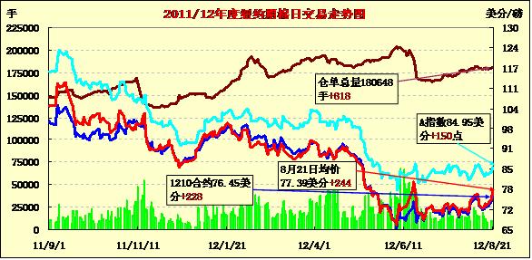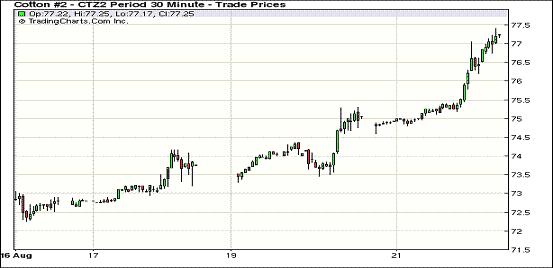 8月21日,美元走低、外部谷物市場(chǎng)強(qiáng)勁上揚(yáng),同時(shí)印度旱情繼續(xù)對(duì)市場(chǎng)形成支持,促紐約期棉再次大幅走高,近期10月合約收于76.45美分/磅,漲228點(diǎn);主力12月合約結(jié)算價(jià)77.30美分/磅,漲247點(diǎn)。市場(chǎng)成交量大幅增加,為兩個(gè)月以來(lái)最高值。市場(chǎng)平開(kāi)高走,主力12月合約在過(guò)去6個(gè)交易日內(nèi)有5日收漲,自8月13日以來(lái)累計(jì)上漲561點(diǎn)。21日該合約一路走高,盤(pán)中突破百日移動(dòng)平均線(xiàn)77美分/磅,當(dāng)日最高至77.49美分/磅,盤(pán)終收于自5月中旬以來(lái)最高點(diǎn)。當(dāng)日外部市場(chǎng)普遍大幅上揚(yáng)。因投資者對(duì)于歐洲官員將拿出應(yīng)對(duì)歐債危機(jī)方案的期望升溫,導(dǎo)致美元走低;同時(shí)谷物市場(chǎng)受旱情影響強(qiáng)勁上漲,印度旱情也引發(fā)市場(chǎng)憂(yōu)慮,在上述因素支持下,紐約期棉拋開(kāi)基本面疲弱的狀態(tài)連續(xù)兩日大幅上揚(yáng)。