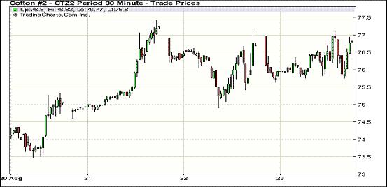 8月23日,紐約期棉市場漲跌不一,近期四份合約微幅下跌,其他合約以不足30點幅度收漲,近期10月合約結(jié)算價75.90美分/磅,主力12月合約76.80美分,均跌17點。市場影響因素多空互現(xiàn),市場盤中波動幅度不大。當(dāng)日市場小幅低開,主力12月合約上半場交易多在75.5-76.5美分間波動,交易中期有買盤介入,該合約短暫沖破77美分,但因缺乏買盤跟進并有賣盤打壓,市場從高位回落,一度下跌到76美分以下,尾段跌勢得以穩(wěn)定,終以微跌收盤?;久嫔隙嗫找蛩鼐F(xiàn),利多因素主要與中國增發(fā)部分加工貿(mào)易棉花進口配額的傳聞有關(guān),同時,印度官方下調(diào)2012/13年度印度棉花種植面積;利空方面,據(jù)氣象部門,熱帶風(fēng)暴“艾薩克”預(yù)計將演變成颶風(fēng),為佛羅里達等地棉區(qū)帶來利好降雨,特別是灌溉區(qū)。