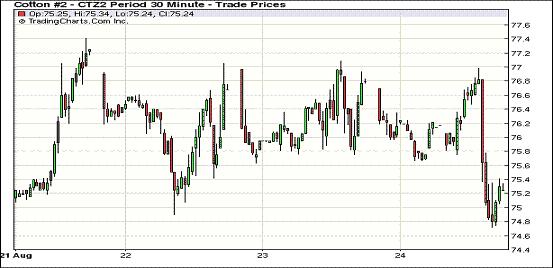 8月24日,紐約期棉市場大幅下跌,近期10月合約結(jié)算價74.45美分/磅,跌145點;主力12月合約75.21美分,跌159點,市場密切關(guān)注熱帶風(fēng)暴艾瑞克動向,美國棉區(qū)棉花長勢不一,對期棉整體影響有限。當(dāng)日市場以弱勢開盤,12月合約試圖挑戰(zhàn)關(guān)鍵支撐點77美分失敗,貿(mào)易商在一周最后一個交易日加大賣盤力度,外部商品市場漲跌不一,期棉以全面下跌收盤。美國主產(chǎn)區(qū)德州苗情不佳,但中南棉區(qū)情況穩(wěn)定,對期棉市場多空不一。