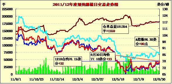 8月30日,雖然颶風“艾薩克”已經(jīng)降級為熱帶風暴,但其破壞力還將持續(xù),同時美棉出口數(shù)據(jù)較好對市場形成支持,紐約期棉受支持繼續(xù)收漲,近期10月合約收于76.15美分/磅,漲32點;主力12月合約結(jié)算價76.94美分/磅,漲29點。當日市場平穩(wěn)開盤,主力合約早盤在美棉出口數(shù)據(jù)利好支持下震蕩走高,盤中基本圍繞76.60美分/磅上下震蕩,交易后半段交易商獲利平倉,打壓市場走低;但買盤在尾盤時分入市促市場反彈,盤終該合約小幅收漲。當日外部市場漲跌不一,玉米及大豆收漲,小麥及原油期貨收跌。美國聯(lián)邦儲備委員會主席貝南克將于周五發(fā)表演講,市場將從其講話中尋求Fed再次推出寬松措施的信號。