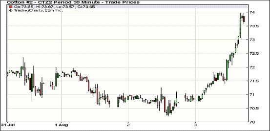 8月3日,在美國經(jīng)濟(jì)數(shù)據(jù)利好及市場對歐元區(qū)憂慮減輕的提振下,美元走低,全球股市及商品市場普遍走高,紐約期棉同樣受助大幅上揚(yáng),近期10月合約結(jié)算價(jià)73.22美分/磅,漲278點(diǎn);主力12月合約73.94美分/磅,漲297點(diǎn)。期棉本周前期橫盤整理,主力合約基本在69-73美分之間橫盤震蕩。昨日市場平開高走,美國7月份就業(yè)數(shù)據(jù)非常樂觀,ISM制造業(yè)數(shù)據(jù)也好于預(yù)期;同時(shí)西班牙可能將很快正式提出救援申請的預(yù)期也提振了市場情緒,主力12月合約一路上行,盤終收于兩個(gè)半月高位。