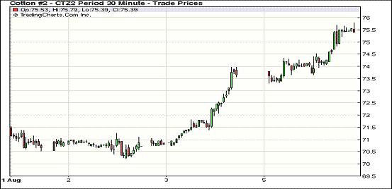 8月6日,因市場圍繞歐元區(qū)危機(jī)的擔(dān)憂減退,美元走弱、歐美股市及多數(shù)商品市場上揚(yáng),同時印度季風(fēng)降雨推遲引發(fā)市場擔(dān)心其下年度產(chǎn)量,紐約期棉在上述因素支持下繼續(xù)大幅上揚(yáng),近期10月合約收于75.12美分/磅,漲190點(diǎn);主力12月合約結(jié)算價75.72美分/磅,漲178點(diǎn)。當(dāng)日期棉低開高走,主力12月合約上半場圍繞74美分/磅上下震蕩;午盤后在美元走弱及印度缺雨消息炒作下大幅上揚(yáng),該合約突破75美分阻力位,盤終收漲近兩百點(diǎn),為近兩個半月高位。投資者們對于歐洲央行行長德拉吉解決主權(quán)債務(wù)危機(jī)的計劃繼續(xù)表示樂觀。德拉吉此前稱,歐洲央行將專注于購買短期債券,這令上周五西班牙與意大利國債收益率出現(xiàn)下跌。印度季風(fēng)降雨推遲到來,至8月2日,其最大產(chǎn)棉區(qū)古吉拉特邦植棉進(jìn)度仍同比落后26%,這引發(fā)市場擔(dān)憂。