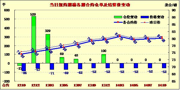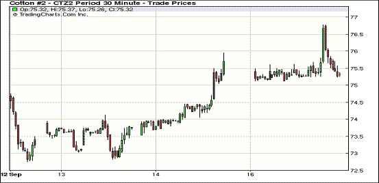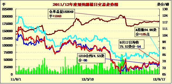 9月17日,在美元走強(qiáng)、外部谷物商品市場大幅走低的拖累下,紐約期棉結(jié)束前兩個交易日的漲勢掉頭收跌,近期10月合約收于74.53美分/磅,跌86點;主力12月合約結(jié)算價75.33美分/磅,跌57點。當(dāng)日市場小幅低開,主力12月合約上半場運行平穩(wěn),基本圍繞75.40美分/磅上下震蕩;午盤后該合約在一撥投機(jī)買盤支持下上行,挑戰(zhàn)77美分/磅未果,最高至76.77美分/磅,為9月11日以來最高值;后外部市場走低打壓期棉回落,該合約回吐全面漲幅,盤終中幅收跌。美聯(lián)儲推出新一輪量化寬松措施促使期棉在上周后兩個交易日持續(xù)上揚,然而其基本面上仍處于疲軟態(tài)勢,主力12月合約過去四周內(nèi)在72-77美分/磅震蕩,本周一(17日)外部市場大跌拖累期棉市場也一同下行。