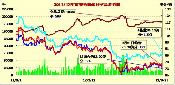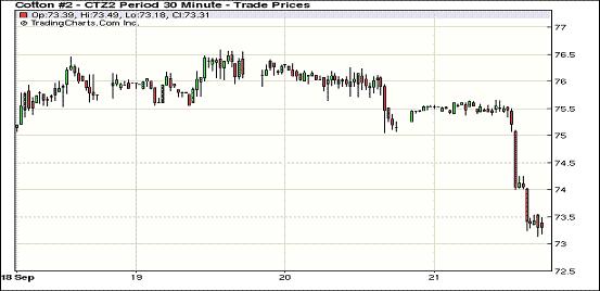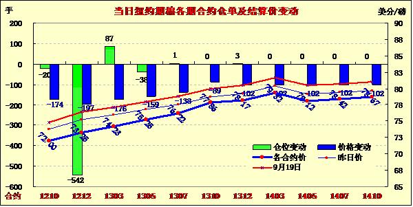 9月21日美元走弱、外圍商品市場普遍走強(qiáng)并未對期棉形成提振,在賣盤(包括商業(yè)、非商業(yè)及技術(shù)賣盤)打壓下,紐約期棉連續(xù)第二個交易日大幅收跌,近期10月合約收于72.00美分/磅,跌174點;主力12月合約73.25美分/磅,跌197點。當(dāng)日主力12月合約上半場運行平穩(wěn),基本在75.5美分一線震蕩,后市場炒作印度季風(fēng)降雨抵消了前期的旱情,該國植棉面積減幅低于預(yù)期,此消息引發(fā)一撥賣盤打壓市場迅速下行,該合約最低至73.14美分;盤終收于8月16日以來最低點。近期10月合約將于下周一(9月24日)進(jìn)入第一交割通知日。市場成交量約2.1萬手,為9月12日以來最高值。